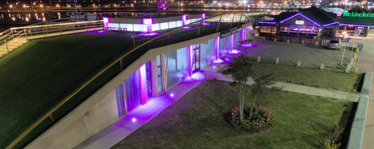 Iluminación Arquitectónica exterior realizada con 24 bañadores de pared Led RGB controlados con App via DMX y 65 metros lineales de luminarias Neon Led en blanco calido instalados en parapetos.
